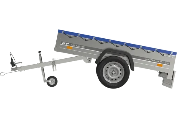 CHASSIS – essieu de torsion d’un fabricant réputé ALKO ou Knott – fait sur mesure pour Unitrailer. Taille de roue : 155/70 R13. Timon basculant de type « V », qui peut être replié sous le plancher de la remorque à tout moment.