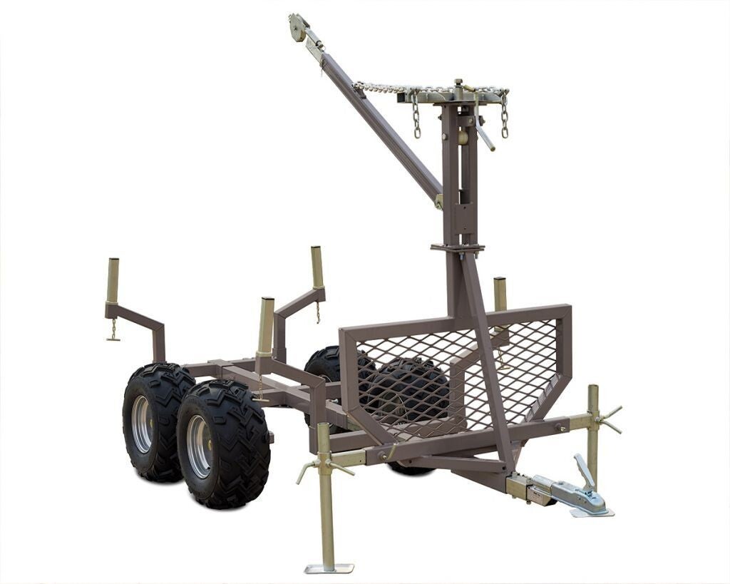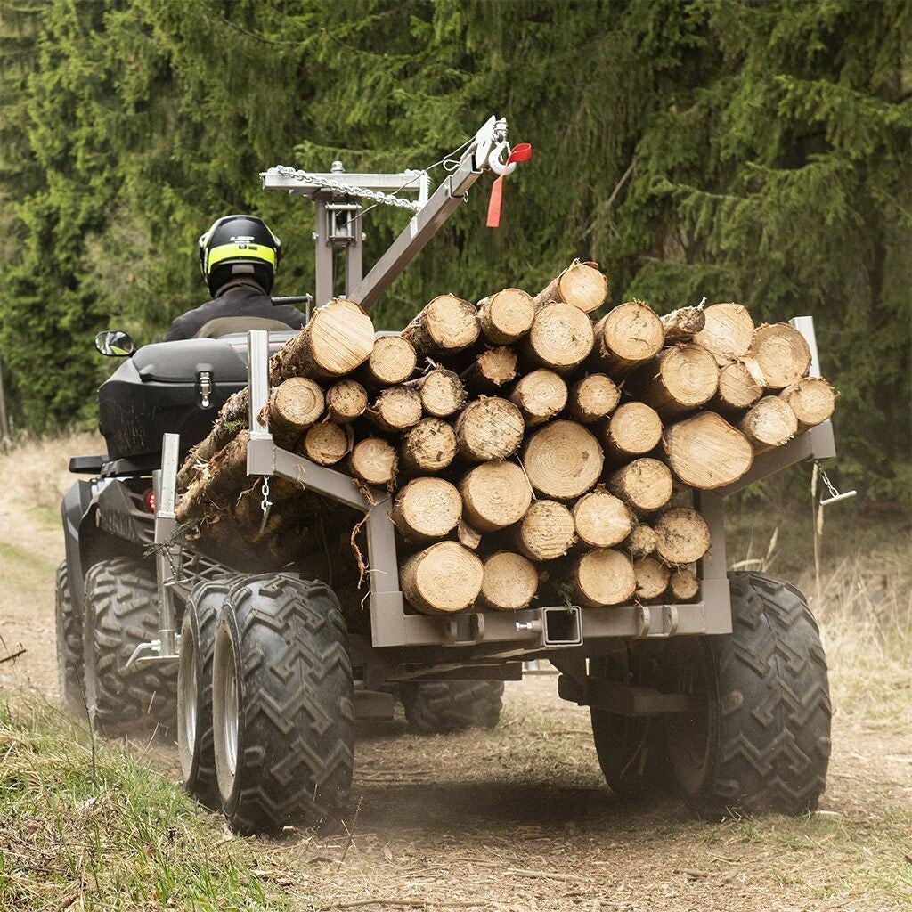 Cette remorque forestière professionnelle de grande capacité est une remorque polyvalente à utiliser avec les VTT et les UTV, mais peut être remorquée avec n'importe quel véhicule tout-terrain équipé d'un coupleur de 50 mm / 2''. Les roues tandem "marchent" sur presque tous les obstacles et confèrent à la remorque d'excellentes capacités hors route permettant une navigation facile sur les souches et à travers les fossés. Quatre pneus à crampons extra-larges à basse pression n'endommagent pas le terrain. Les panneaux avant et arrière peuvent facilement être retirés et le lit converti en un lit de pieu pour transporter des charges plus longues telles que des bûches, des buissons ou du bois. Les stabilisateurs latéraux maintiennent la remorque stable lors du chargement ou du déchargement avec la nacelle élévatrice.